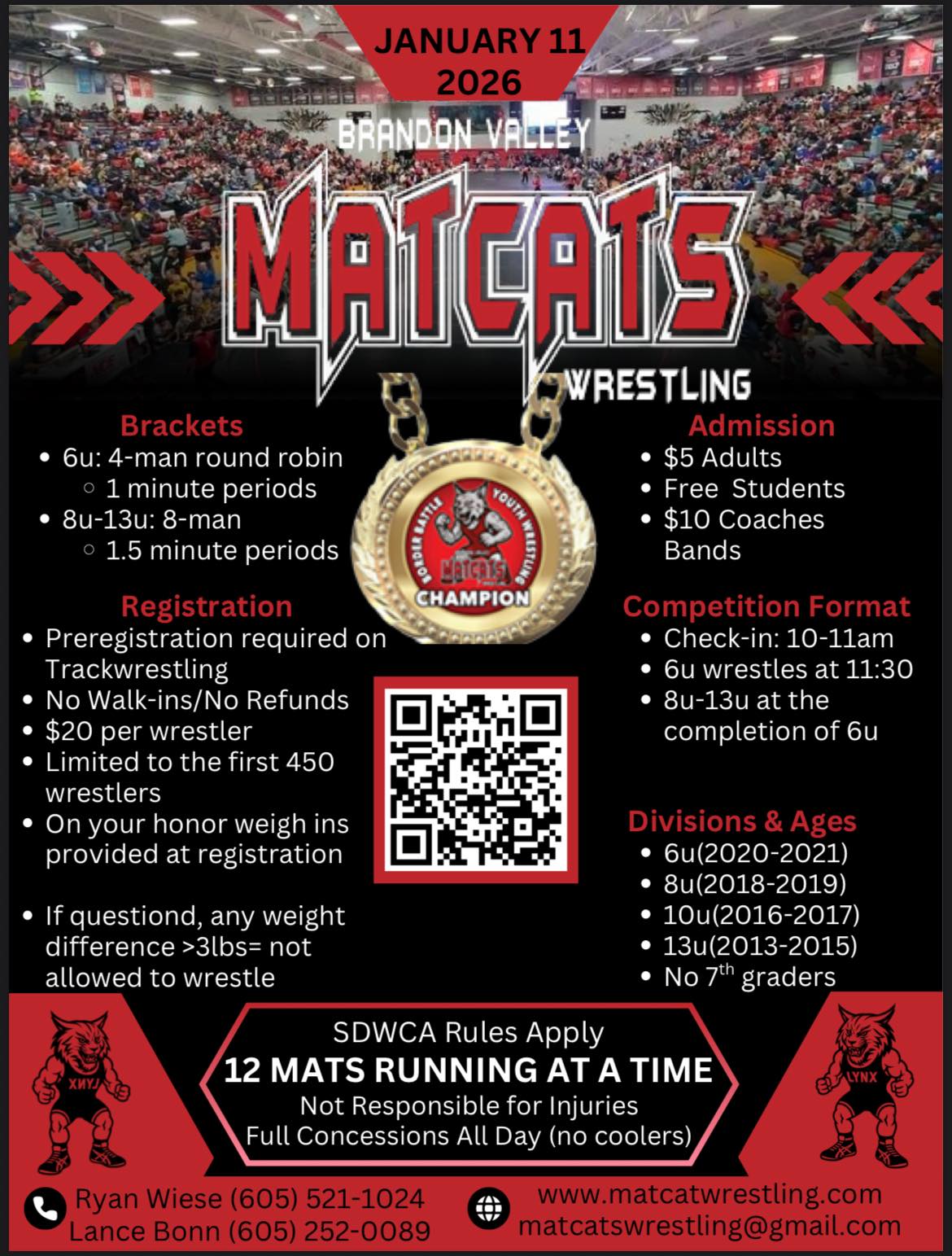 Brandon Valley MatCats Pre-register only on trackwrestling.com, limited to first 450 wrestlers. + Add to Google Calendar + iCal / Outlook export Date Jan 11 2026 Expired! Time All Day Cost $20.00 More Info Sign Up! Location Brandon Valley Category Tournaments Share this event