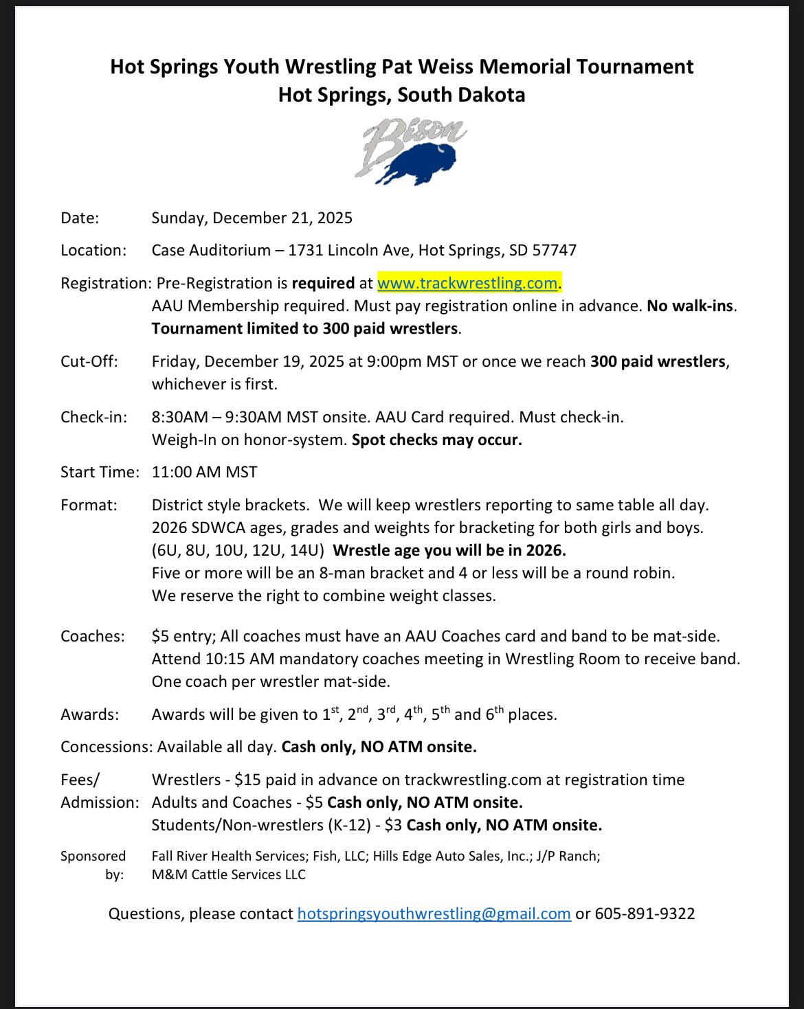 Pat Weiss Memorial Tournament + Add to Google Calendar + iCal / Outlook export Date Dec 21 2025 Expired! Time All Day Cost $15.00 More Info Sign Up! Location Case Auditorium 1731 Lincoln Ave, Hot Springs Category Tournaments Share this event