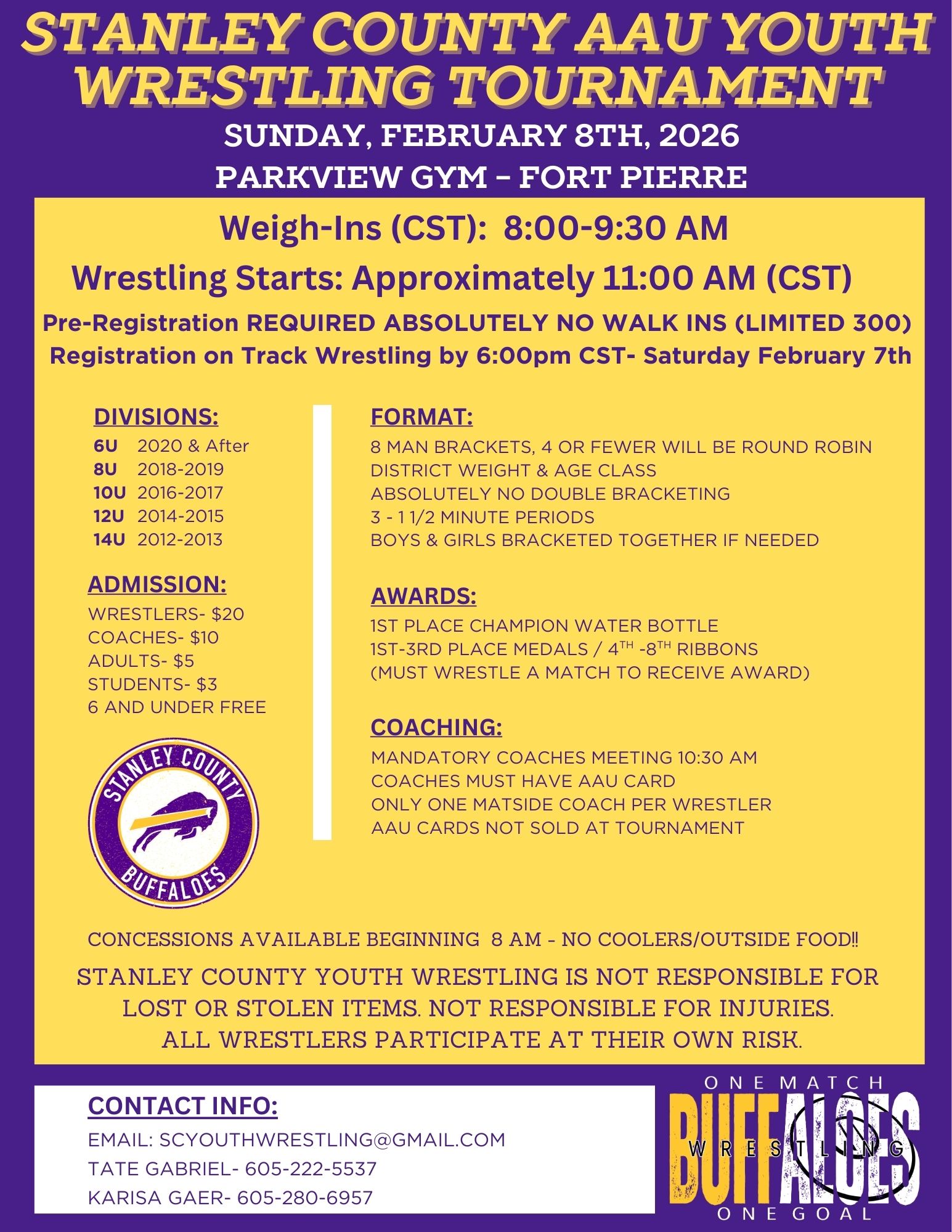 Stanley County AAU Youth Tournament + Add to Google Calendar + iCal / Outlook export The event is ongoing. Date Feb 08 2026 Ongoing... Time All Day Cost $20.00 More Info Sign Up! Location Parkview Gym Fort Pierre Category Tournaments Sign Up! Share this event